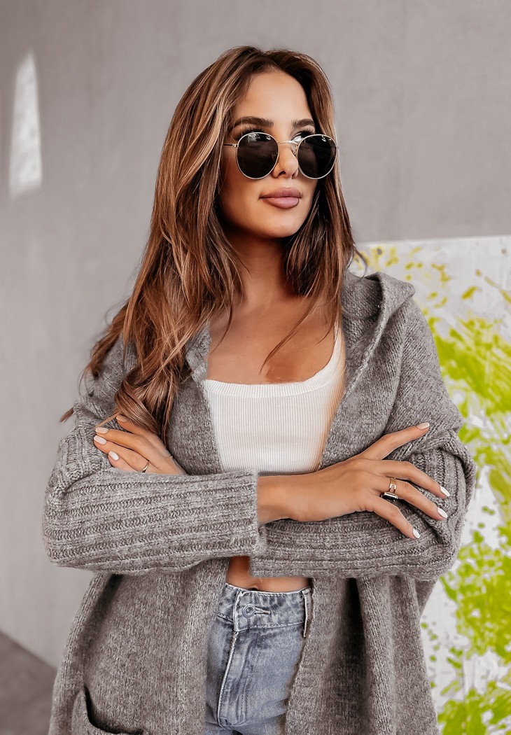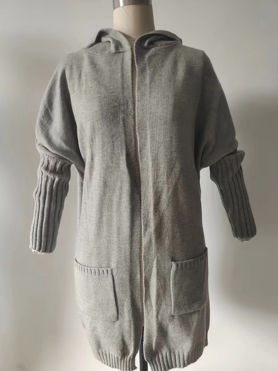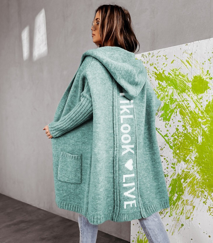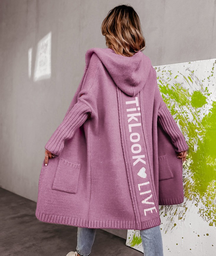 Novo suéter de malha feminino outono e inverno 2024, cardigan TikLook solto, comprimento médio, jaqueta com capuz