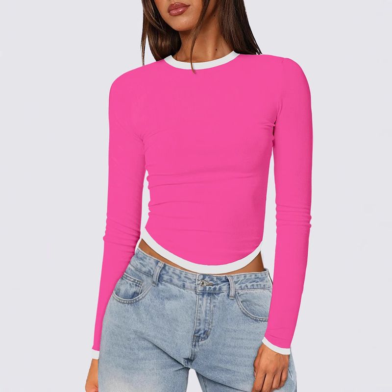 2025 Women's Spring Summer New Long Sleeve Round Neck Slim Fit Color Block Pullover Top