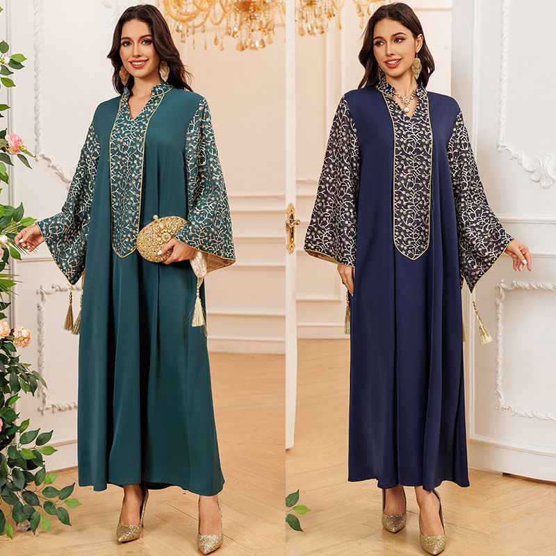 AB438 Plus Size Roupas Femininas Dubai Kaftan Bordado Patchwork Borla Vestido Maxi Muçulmano