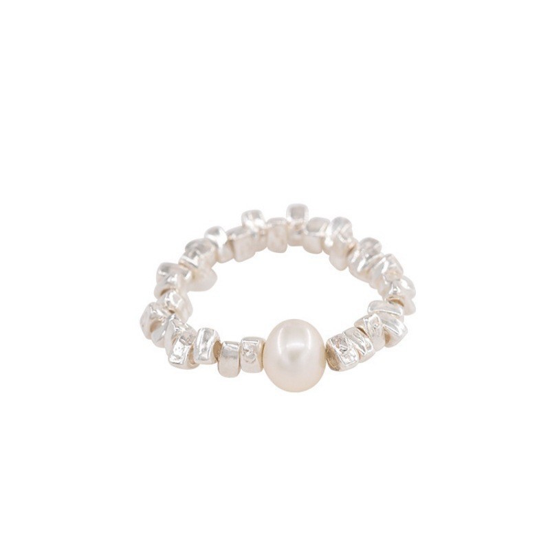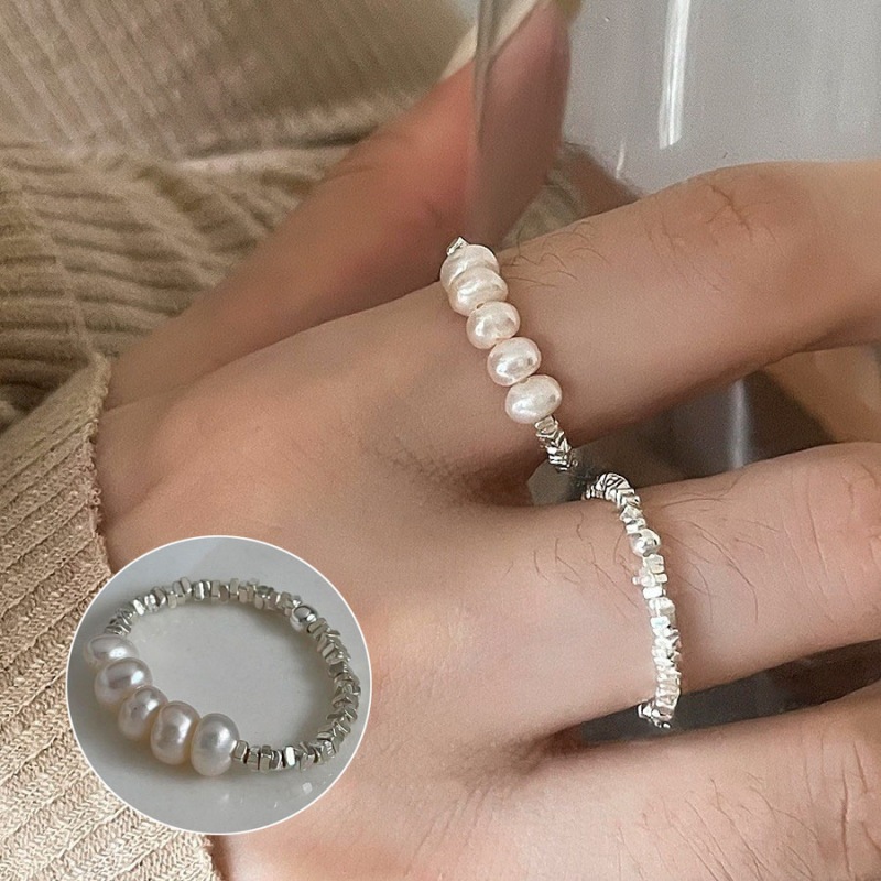 Anel feminino francês vintage, elegante e atemporal com contas geométricas de pérolas. Anel empilhável em prata S925, com design romântico e moderno.