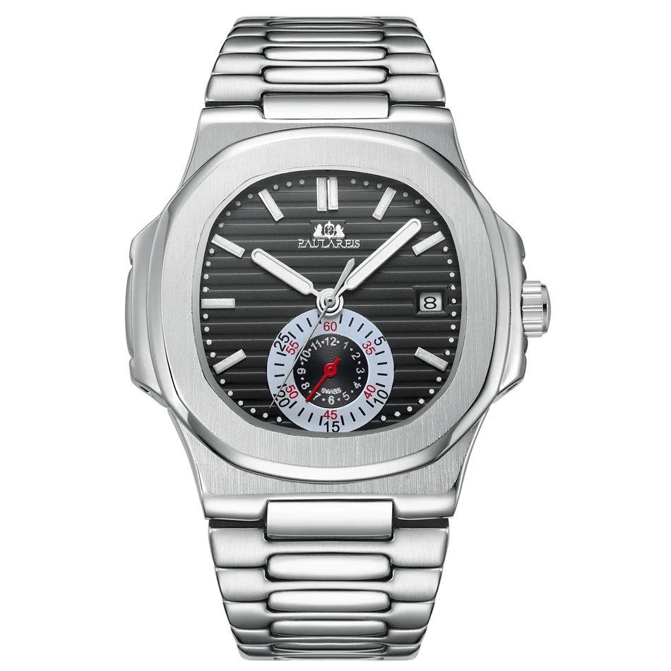 Case Shape:Irregular ShapeDial Window Material Type:HardlexBoxes & Cases Material:No packageDial Diameter:40mmCase Thickness:13mmBand Length:21cmBand Width:25mmBand Material Type:Stainless SteelFeature:Luminous,Auto DateStyle:DRESSWater Resistance Depth:3BarClasp Type:Folding Clasp with SafetyCase Material:Stainless SteelMovement:Automatic Self-WindBrand Name:PAULAREIS POrigin:Mainland ChinaGender:Men