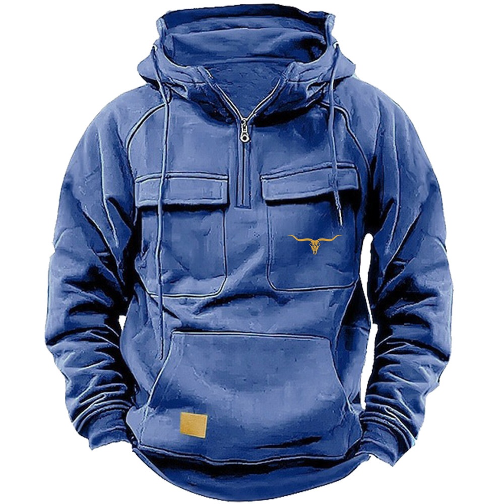 Moletom masculino estilo retrô europeu/americano com vários bolsos, estampa de cabeça de touro e zíper, ideal para trabalho, ideal para o outono e inverno.
