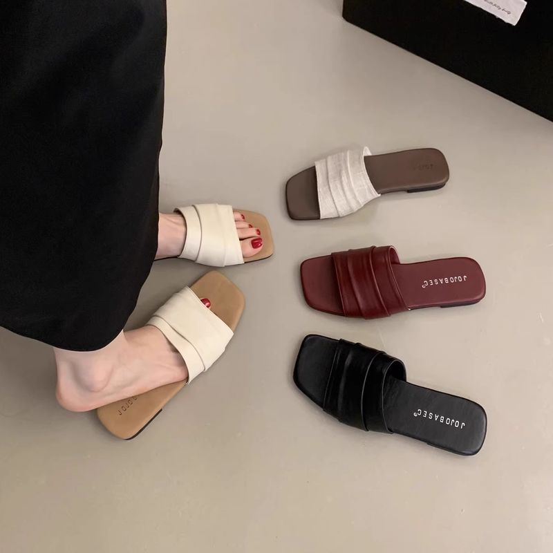 Chinelos de couro plissado coreano para mulheres, sandálias rasteiras e macias para férias na praia, chinelos estilo fada com uma tira
