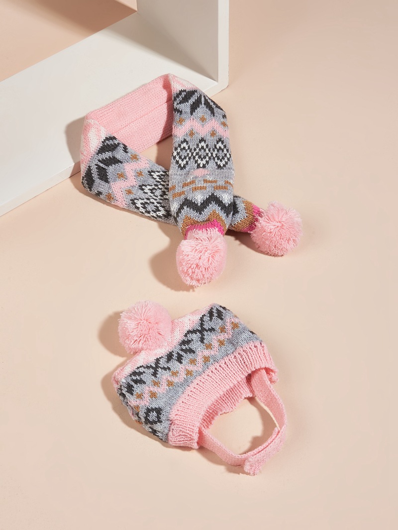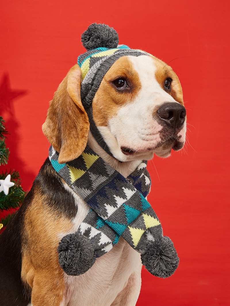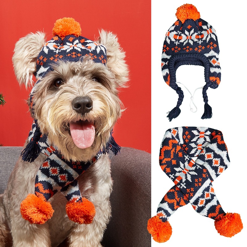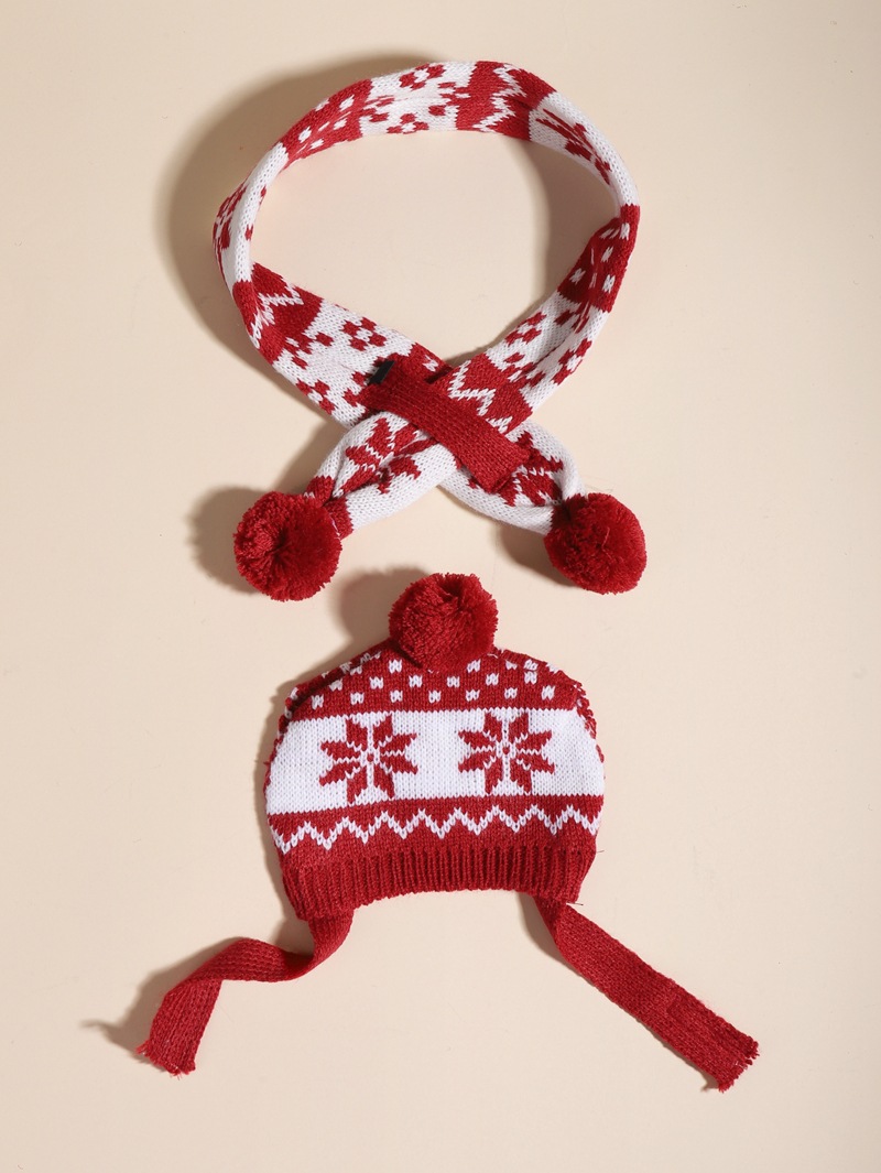 【Product Name】Christmas new pet dog knitted cute warm fur ball snowflake triangle lattice multi color Scarf and hat set