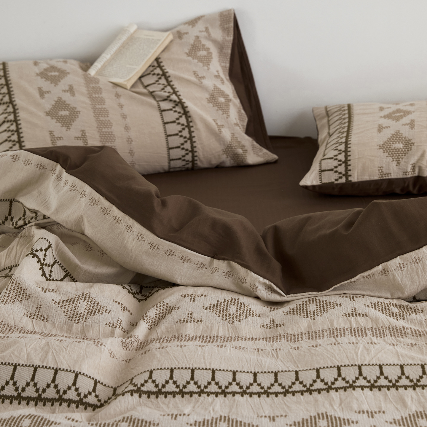 Conjunto de cama de quatro peças em algodão puro, tingido com fios, estilo nórdico francês minimalista retrô vintage, com matelassê Fair Isle e estampa jacquard. Acabamento sofisticado.