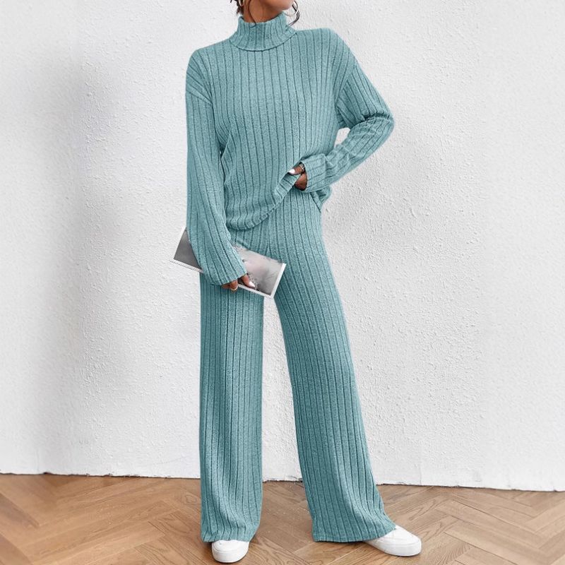 2024 Autumn Winter Casual High Neck Knitted Fleece Long Sleeve Set Women's Sweater Loose Pants
