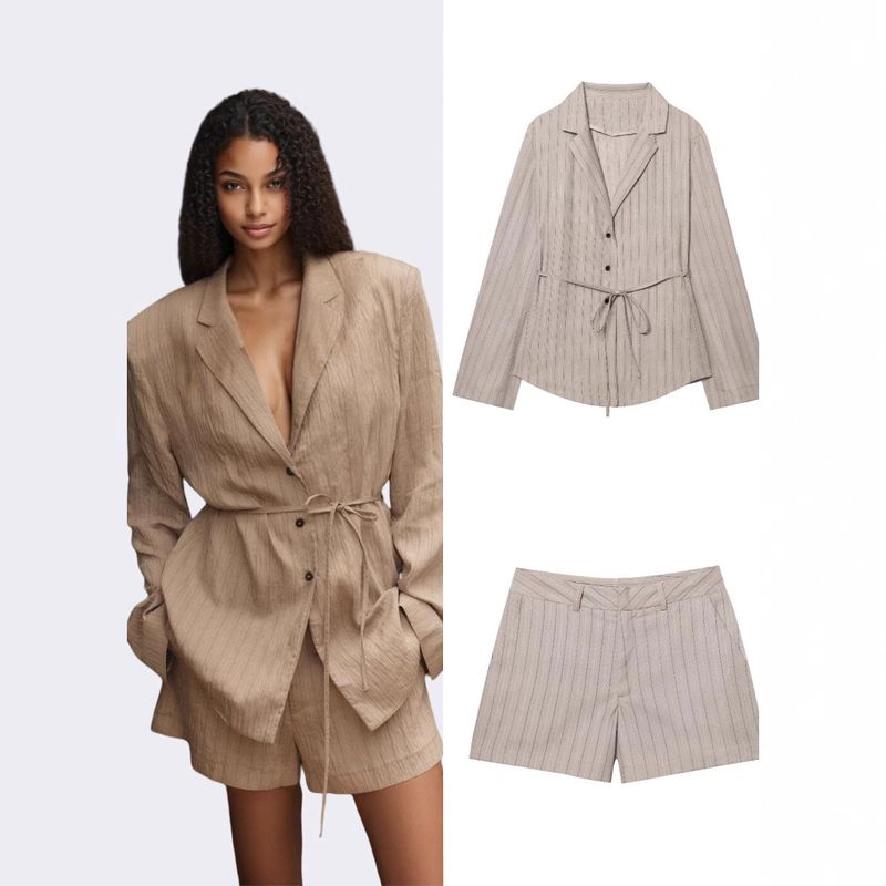 GraceChic 2025 Novo Conjunto Feminino Slim Listrado com Blazer e Shorts Curtos com Cinto de Amarrar Y13-21015