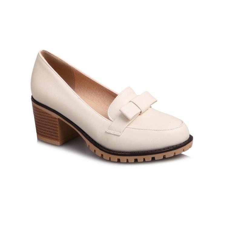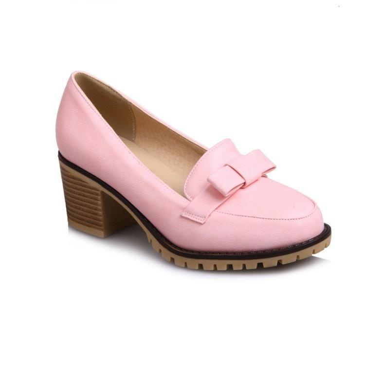 Mocassins com laço, bico redondo, abertura rasa, modelo único, salto médio, estilo europeu e americano, tamanho grande, para mulheres.