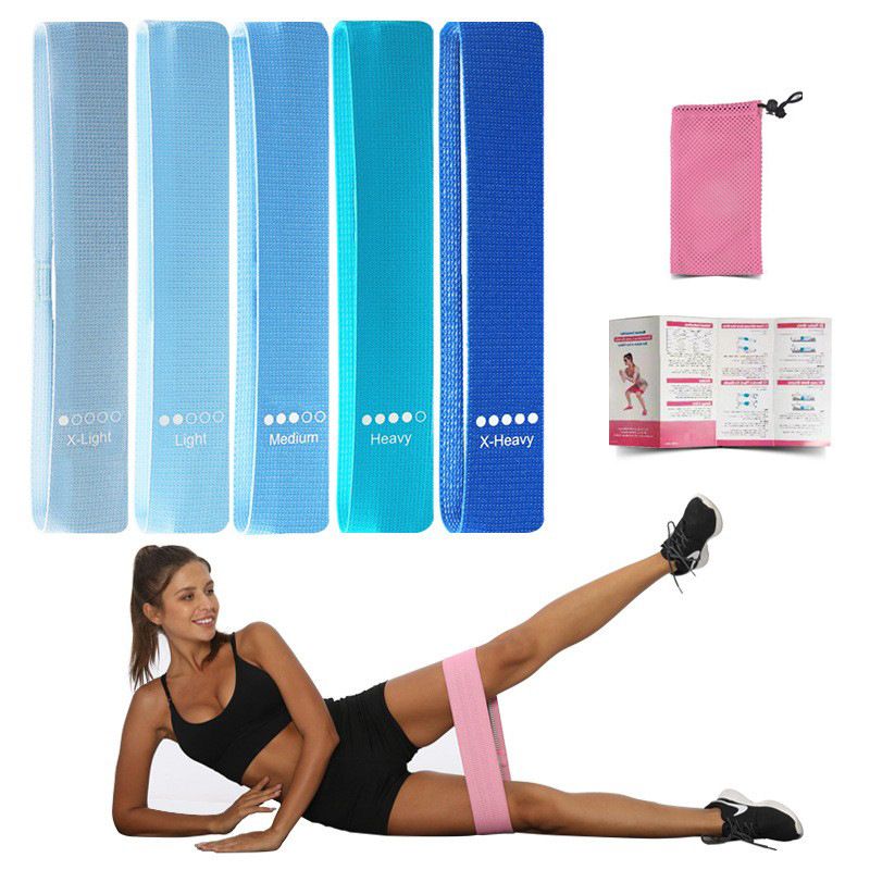 Pacote com 5 faixas elásticas de resistência para agachamento, elevação de quadril e exercícios de ioga, com gradiente azul.