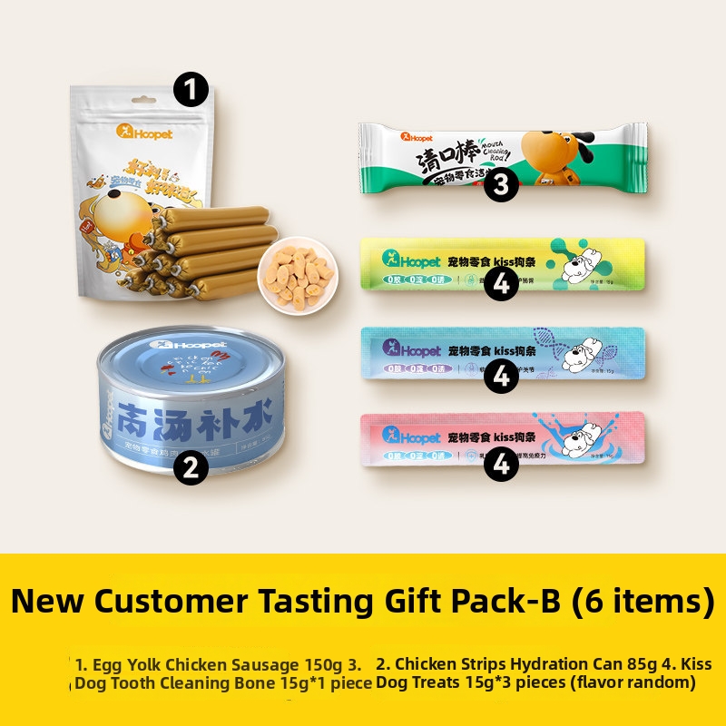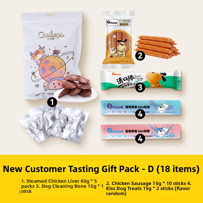 Pacotes de degustação de petiscos para cães, ração úmida, salsichas de peito de frango, palitos mastigáveis, amostras de alimentos enlatados, produtos para animais de estimação.