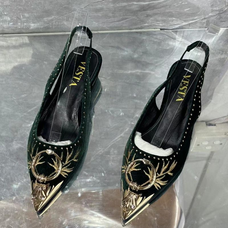 Sandálias de salto alto estilo nicho, bico fechado, salto fino, bico fino, sem costas, primavera 2025