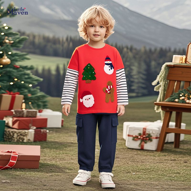 Fornecedor de roupas de fábrica, atacado, estilo natalino europeu e americano, camisetas infantis de algodão com estampas de desenhos animados para meninos, ideais para o outono.