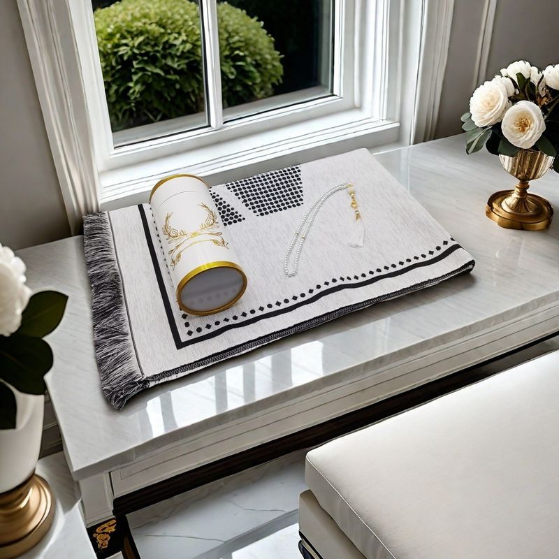 Blanket size 70x110cm A set weighs approximately 300g Tube size: 10.5x10.5x22cm White Prayer Rug Rosary Prayer Tube Three-Piece Set; Patterns Available, Welcome to Inquire